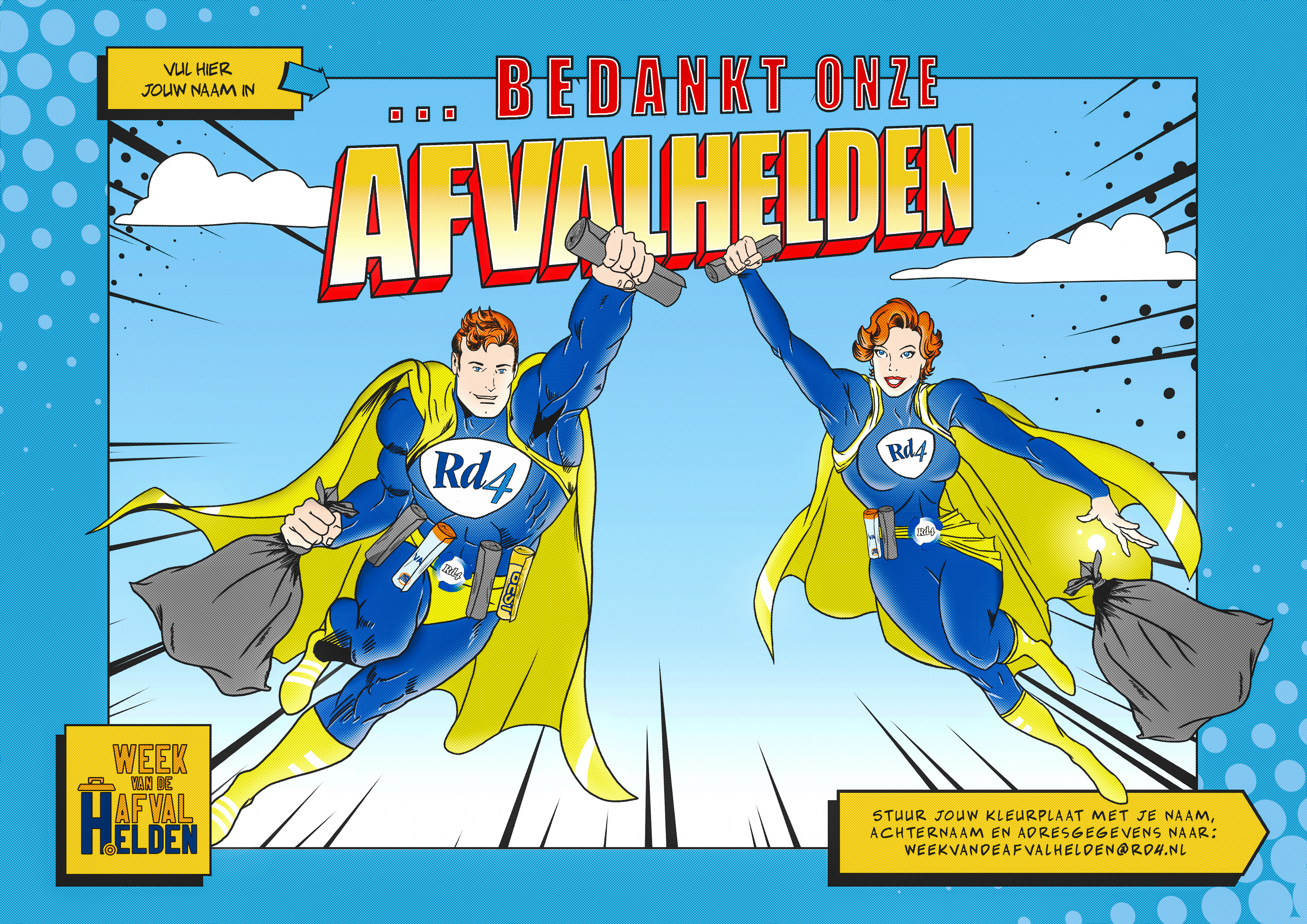 Kleur de afvalhelden kleurplaat in, hang hem achter je raam en maak een foto van jouw kunstwerk.